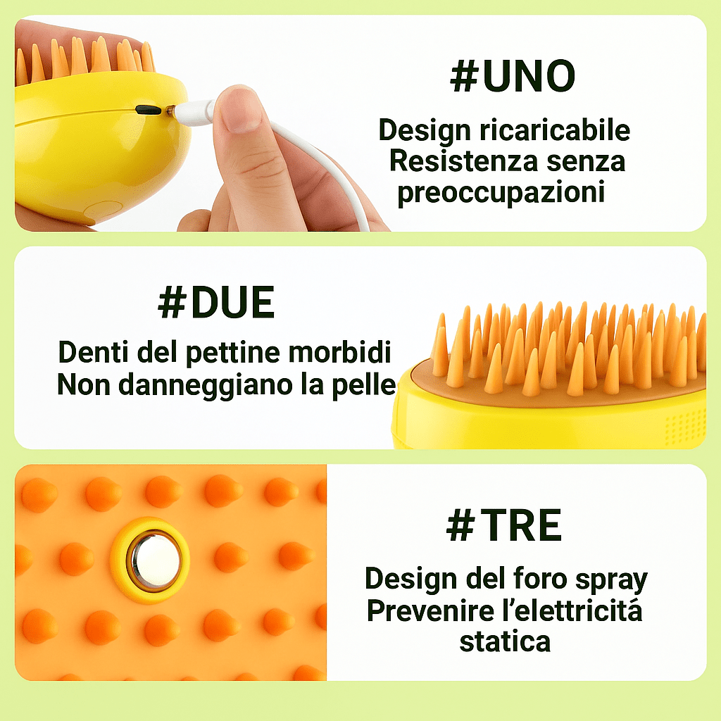 La tua nuova alleata per la cura quotidiana del pelo! Questa spazzola a vapore per animali domestici districa, massaggia e rimuove i peli superflui senza irritare la pelle. Ideale per mantenere il pelo morbido, sano e brillante, con un tocco di coccole.